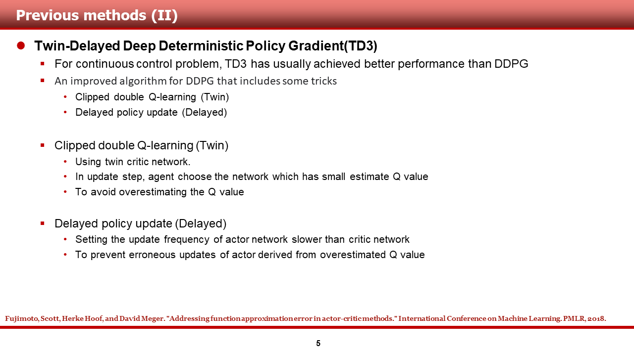 이 알고리즘의 경우, DDPG에서 발생했던 여러 문제점 중 하나인 Q value의 overestimate 문제를 완화시킬 수 있는 여러 트릭을 사용함으로써 DDPG의 성능을 개선한 알고리즘으로 알려져 있습니다. 그 트릭들은 다음과 같습니다.