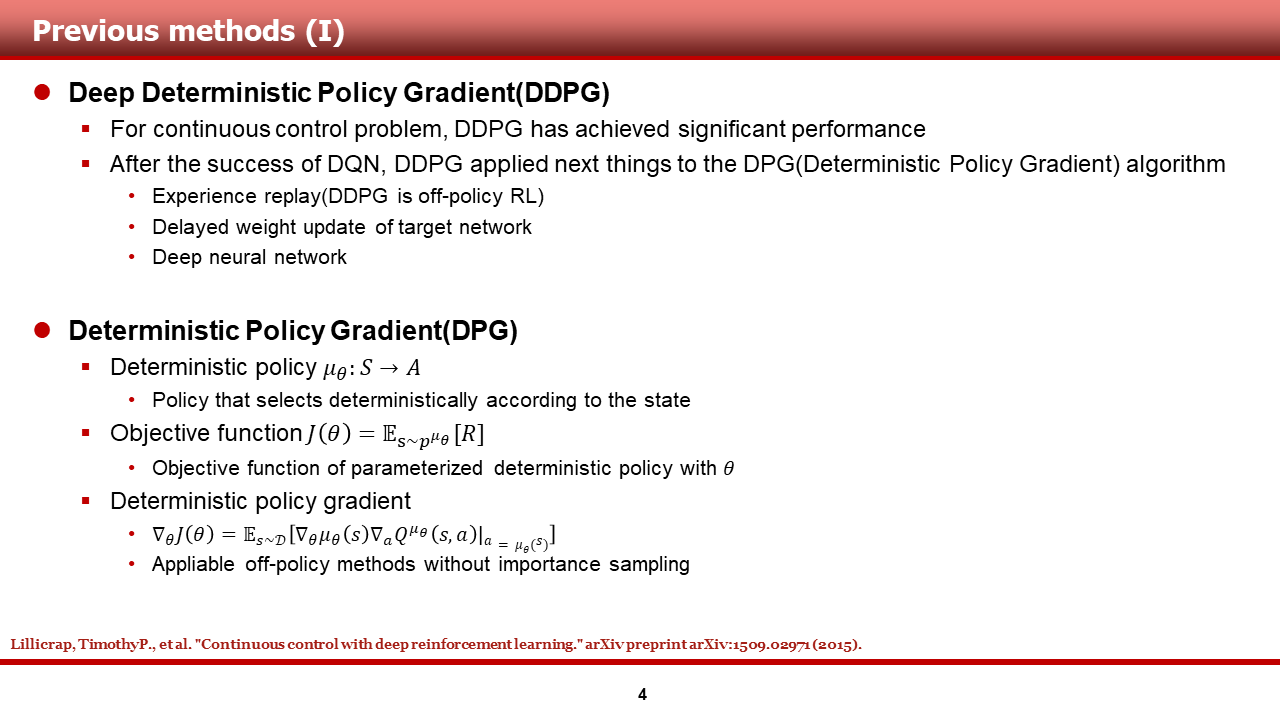 강화학습 논문 리뷰 연재 네번째입니다. 이번 논문 리뷰는, 기존의 DeepMind control suite, 상용 동역학 시뮬레이션 프로그램 등의 continuous control 환경에서 좋은 성과를 거둬온 DDPG(Deep Deterministic Pol..