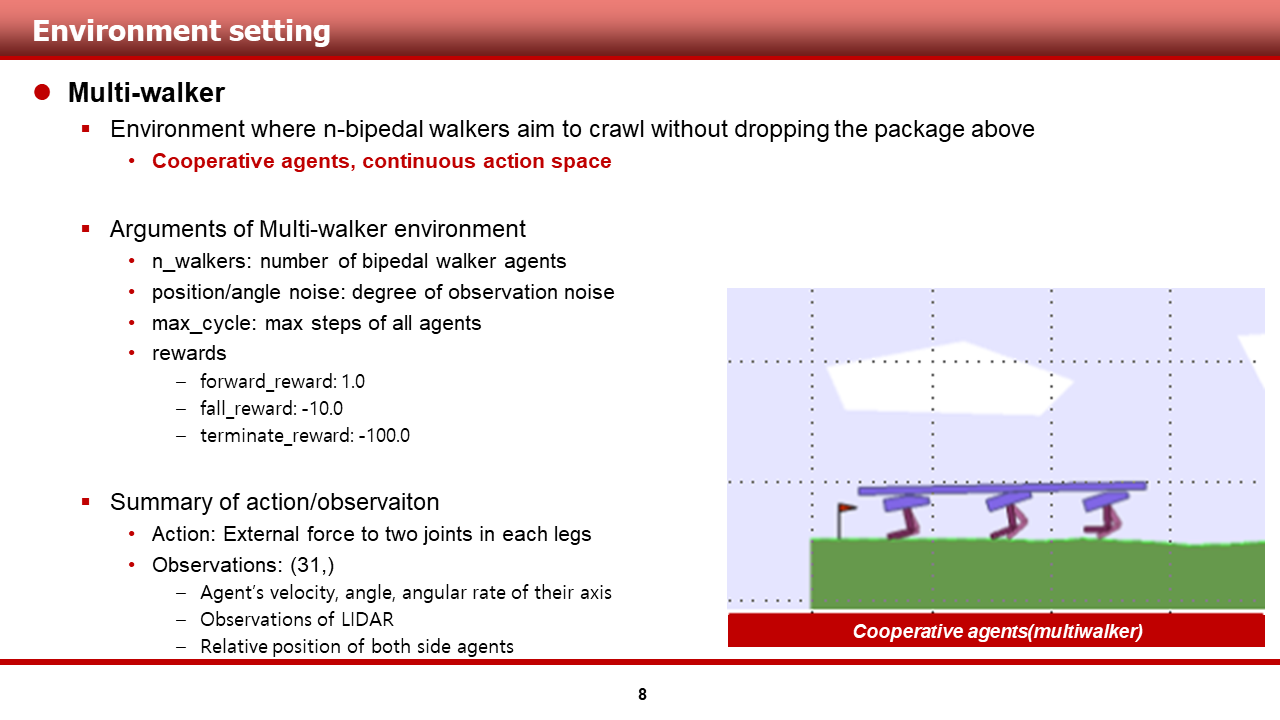 기존의 bipedal walker 문제만 하더라도, 상당히 난이도 있는 continouos control 문제인 것으로 알고 있는데, multi-agent간의 협업을 연구하기 위해 스탠포드가 우물에 독을 푼 것이 아닌가 하는 생각이 들게끔 하는 환경입니다.