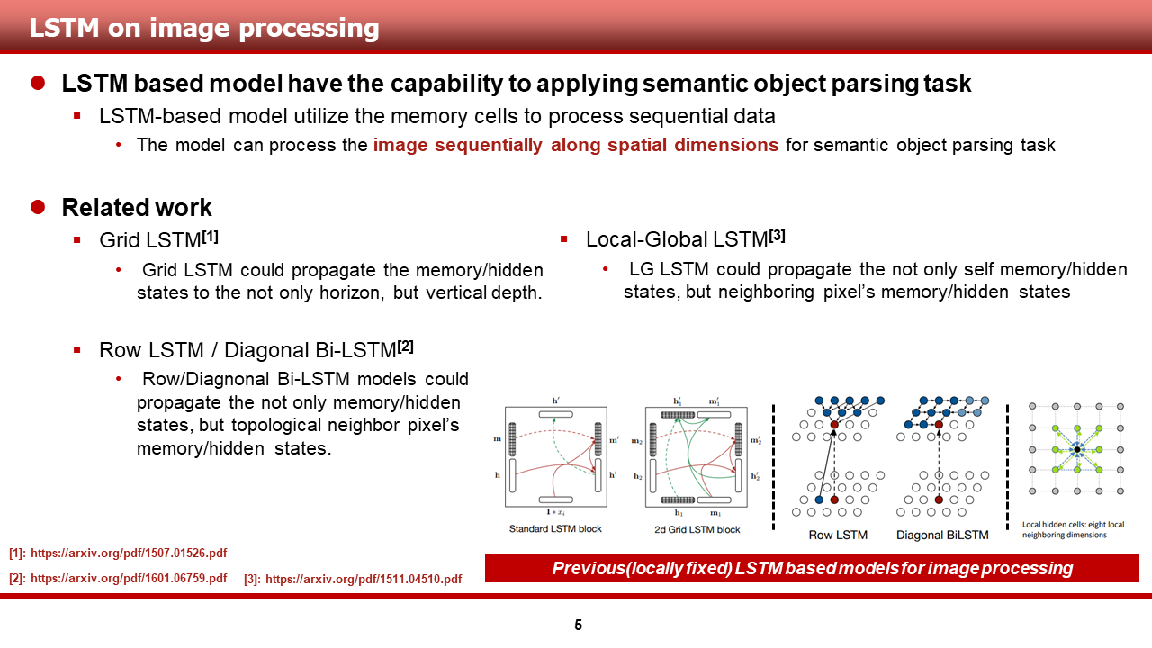 그리하여, 이러한 단점을 극복하기 위해, 이전의 연구자들은 imaga에 LSTM 기반의 모델들을 적용하는 연구를 수행하여 semantic object parsing 태스크를 해결해 왔다고 언급합니다. 자연스레 다음 장으로...