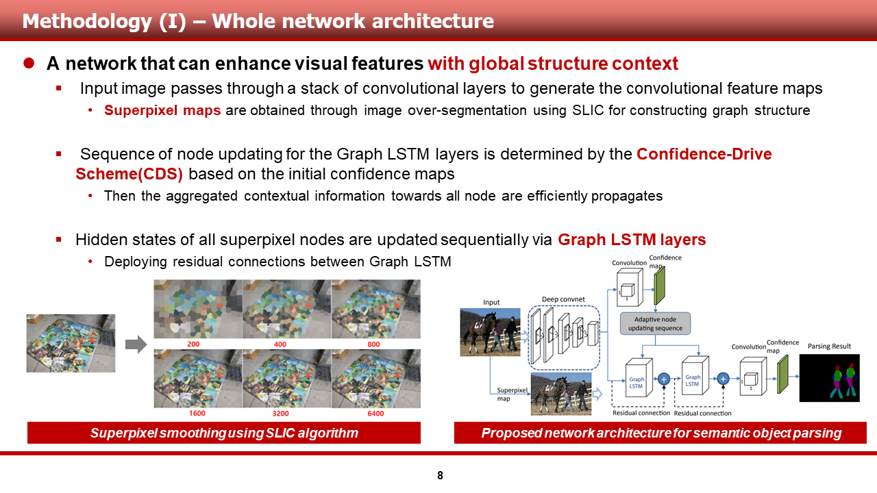 Graph LSTM의 경우, image를 입력받아, 해당 image의 pixel들이 어떤 의미론적 의미를 가지고 있는지 mapping 해주는 오른쪽 아래의 전체 그래프 상에서, 추출된 visual feature들에 global structure context에 대한 이해도를 향상시켜주는 역할을 하고 있습니다. 즉, 단일 모델로써 역할을 하는 친구는 아닙니다.