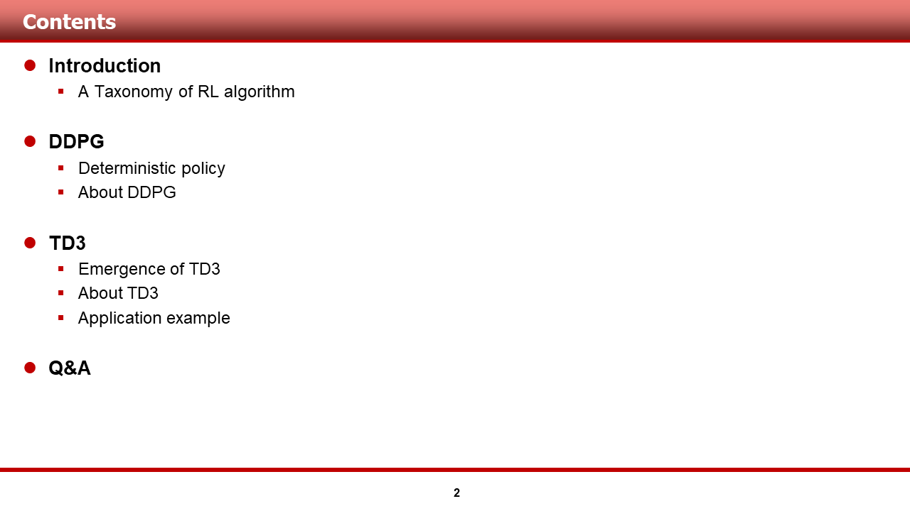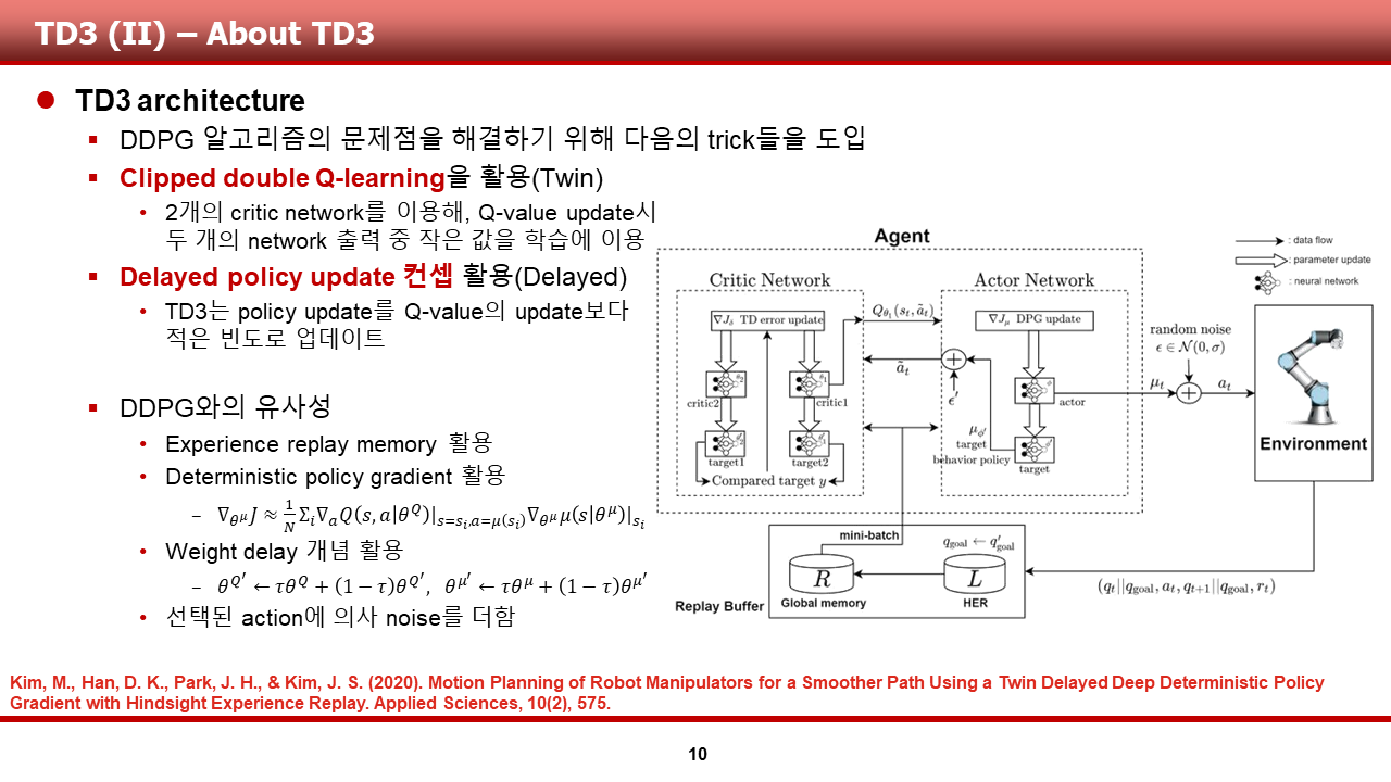 그후, 본론에서는 TD3가 어떠한 이유로 출현하게 되었는지 설명드리기 위해 기존의 DDPG에서 발생한 문제에 대한 설명 드리고, TD3가 어떤 방법으로 이러한 문제를 해결하였는지, 그리고 어떤 환경에 적용하여 TD3의 성능을 검증하였는지에 대해 설명을 드리는 것으로 자료를 준비했습니다.