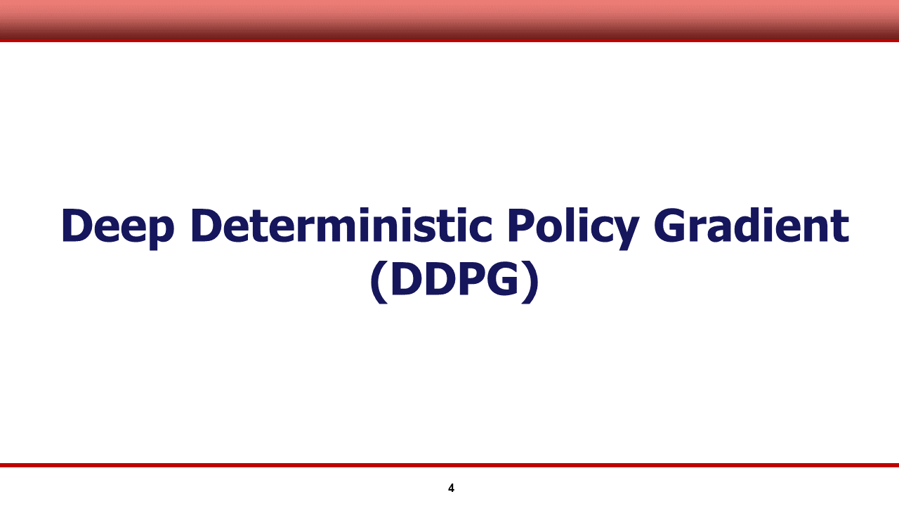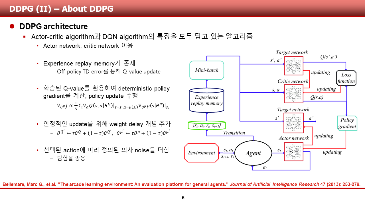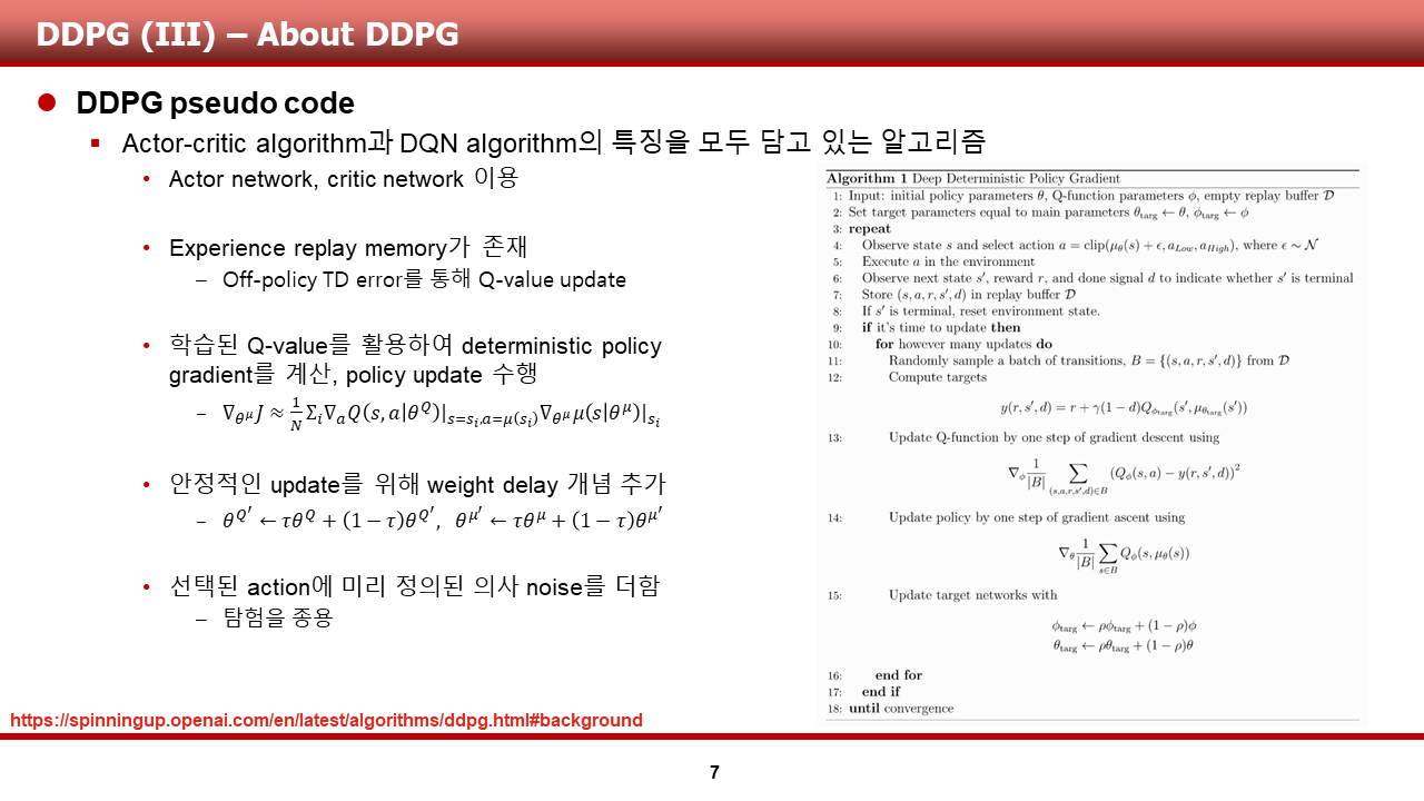 DDPG의 경우, Actor-Critic algorithm과 DQN algorithm의 특징을 모두 담고 있는 알고리즘입니다. 그리하여, 슬라이드 하단 주석된 논문에서 참고한 DDPG arcthitecture를 보시게 되면,