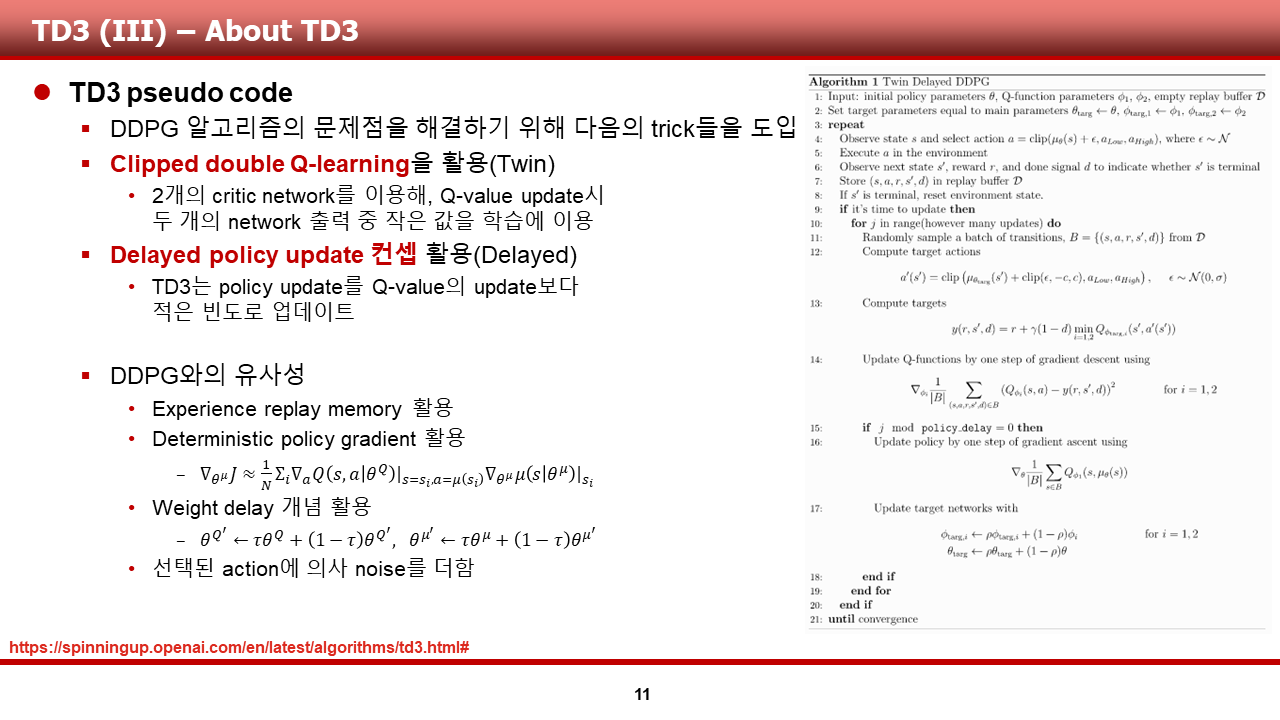 OpenAI에서 제공하는 TD3의 psudo code에서는 이러한 과정들이 어떻게 적용되었는지 확인할 수 있습니다. 이 pseudo code에서 아쉬운점은 더 작은 Q-value를 policy gradient 계산시 사용한다는 것이 명시적으로 드러나지 않았다는 것이지만, 그래도 보기좋게, 깔끔하게 서술이 되어 있어 사용하게 되었습니다.
