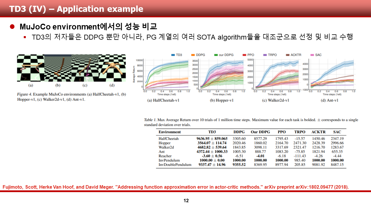 이 장에서는, TD3의 저자들이 TD3를 MuJoCo physice engine에서 다른 PG 계열 SOTA 알고리즘과 비교한 그래프 및 표를 보여드리겠습니다. 저자들은 여러 scenario를 학습 시켰으며, 그중 HalfCheetah, Hopper, Walker, Ant의 그래프를 ppt에 도시해 두었습니다.