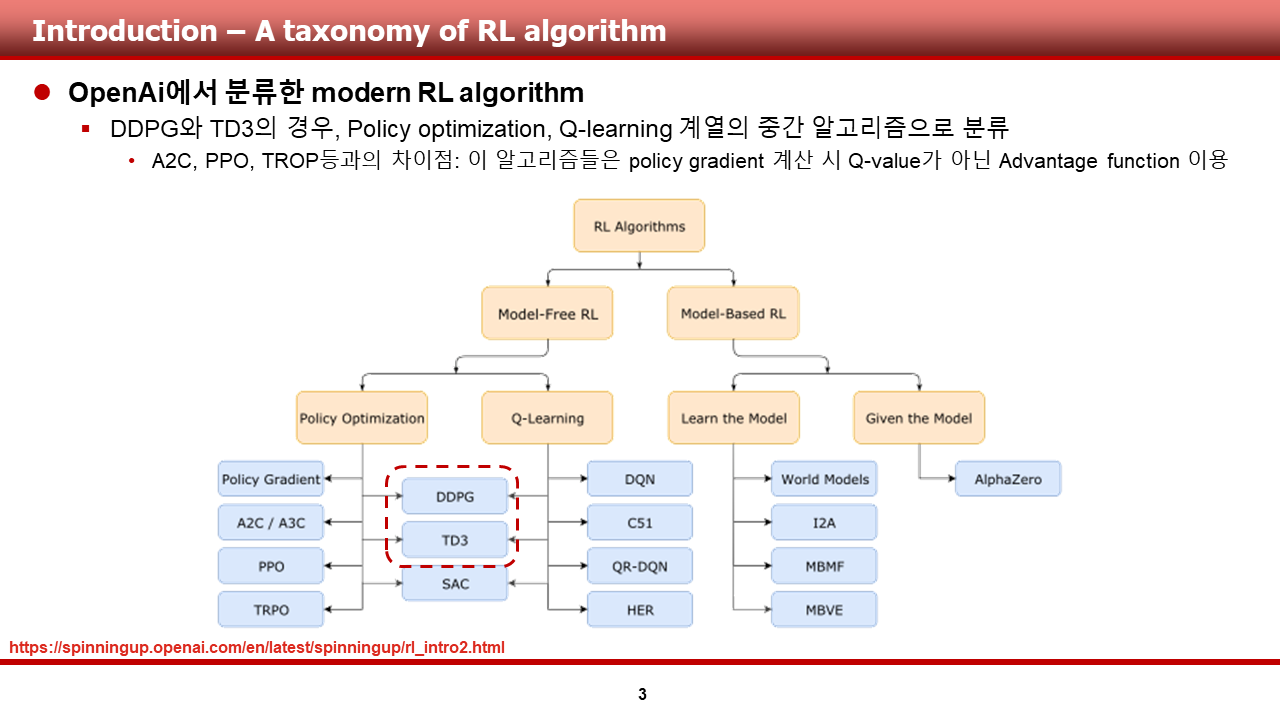 DDPG와 TD3의 경우, 그림에서 볼 수 있듯이 model-free RL 알고리즘으로 분류할 수 있으며, 세부 계열로는 policy optimization과 Q-learning 계열의 중간 단계로 분류되어 있다는 것을 확인할 수 있습니다.