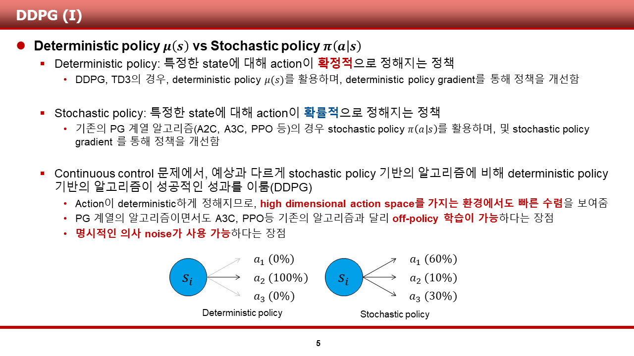 이 장에서 추가적으로 알고 넘어가야할 지식은, 상식적으로 생각할 수 있는 사실과는 다르게도 제어, planning등과 같은continuous control problem문제에서 stochastic policy 기반 알고리즘에 비해 deterministic policy 기반의 알고리즘이 성공적인 성과를 이뤄왔다는 것입니다. (주로 DDPG알고리즘과 LSTM등의 RNN 네트워크를 활용하여 많은 성공을 얻어왔습니다.)
