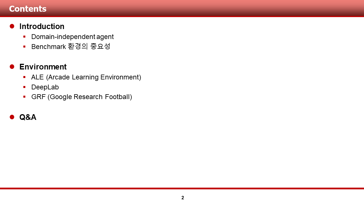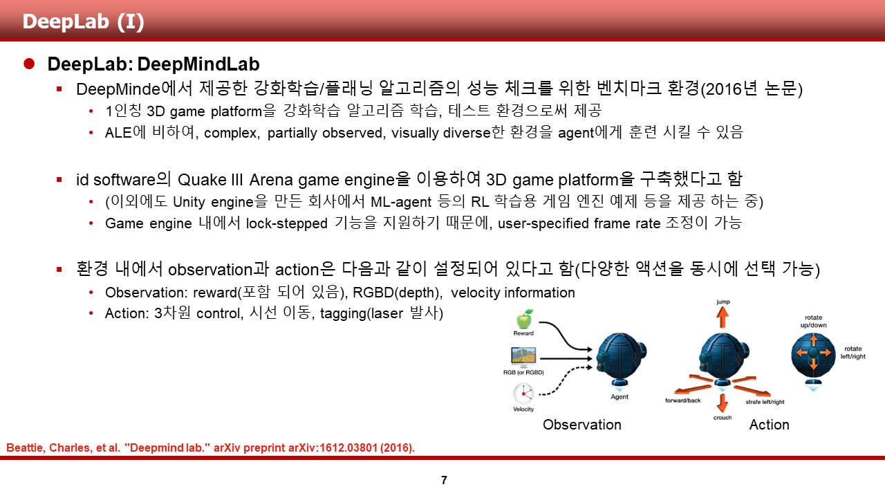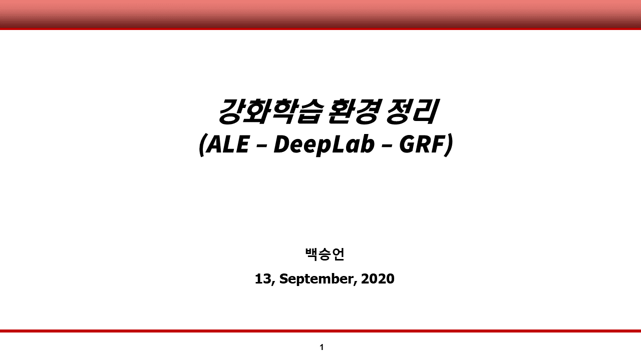 그 후, 본론에서는 ALE, DeepLab, GRF 이 3개의 환경에 대해 각각 설명을 드리는 것으로 자료를 준비했습니다. 각 환경들을 비교하는 것도 물론 의미가 있겠지만, 목적 자체가 많이 다른 환경들이기 때문에 자료에 추가하지는 않았습니다.