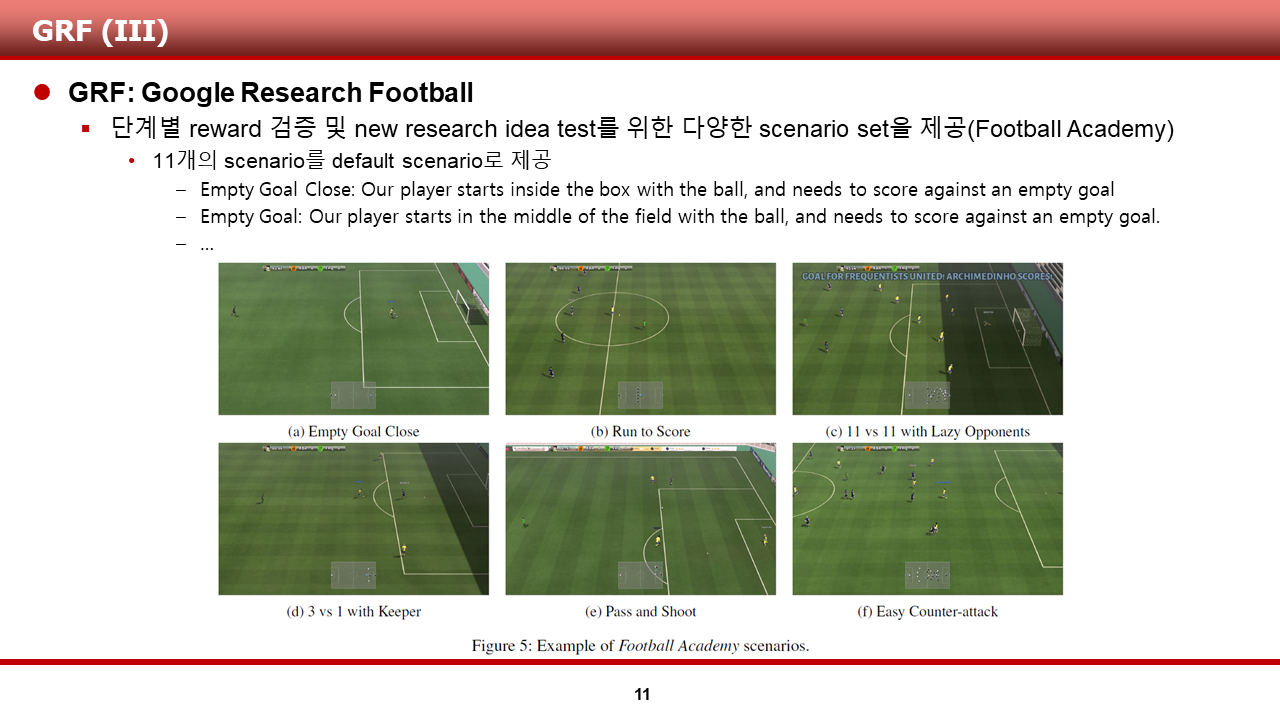 또한, 환경을 이용하는 연구자들이 단계별 reward 검증 및 새로운 research idea test를 하기 위한 11개의 예제 scenario set을 저자들은 제공해 주고 있었습니다. 연구자들은 이러한 예제들을 이용하여 궁극적으로 레바뮌에 맞먹는?! 최강의 agent를 만들기 위하여, 단계적으로 goal을 잘 넣는 공격수와 goal을 잘 막는 골키퍼 등 단계적으로 agent를 학습시킬 수 있을 것입니다.