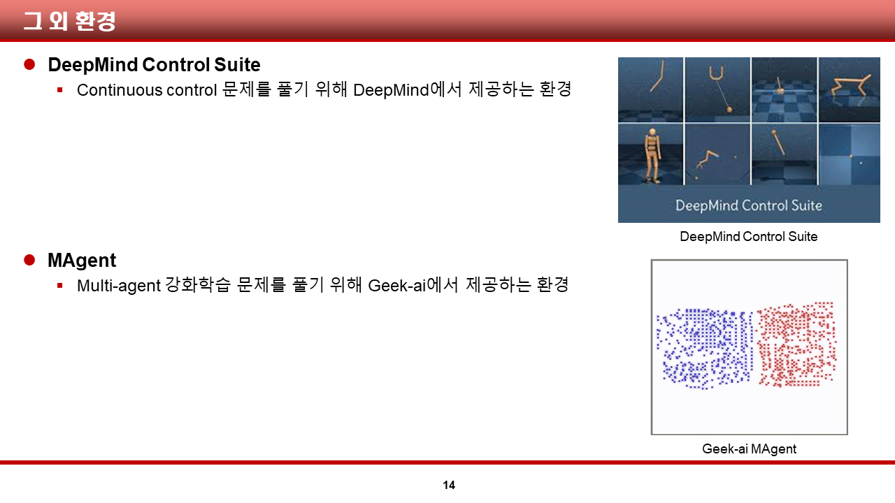 지금까지 설명드린 ALE 환경과 DeepLab, GRF이외에도 여러 유명한 환경들이 있습니다. 그 중, 대표적인 두 개의 환경에 대해서 간단히만 소개해 드리도록 하겠습니다.