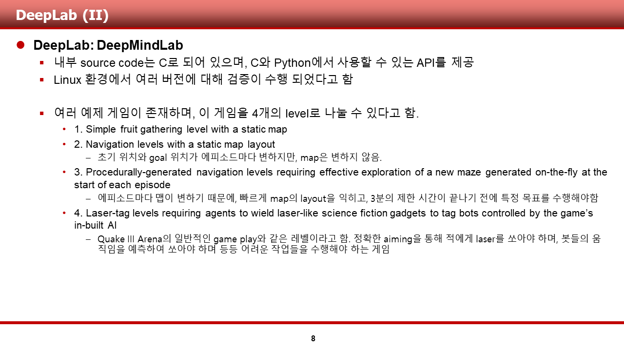 또한, 환경을 이용하는 연구자들은, agent 학습에 사용할 수 있도록 여러 예제 게임을 4개의 난이도 별로 제공한다고 하며, 각 난이도에 대한 명칭과 자세한 설명은 PPT에 옮겨 두었기에 생략하겠습니다. 연구자들은 이러한 예제들을 이용하여 궁극적으로 Quake 게임 상에서 적을 때려잡는 괴물 agent를 학습시키기 위하여, 단계적으로 agent를 학습할 수 있는 것입니다.