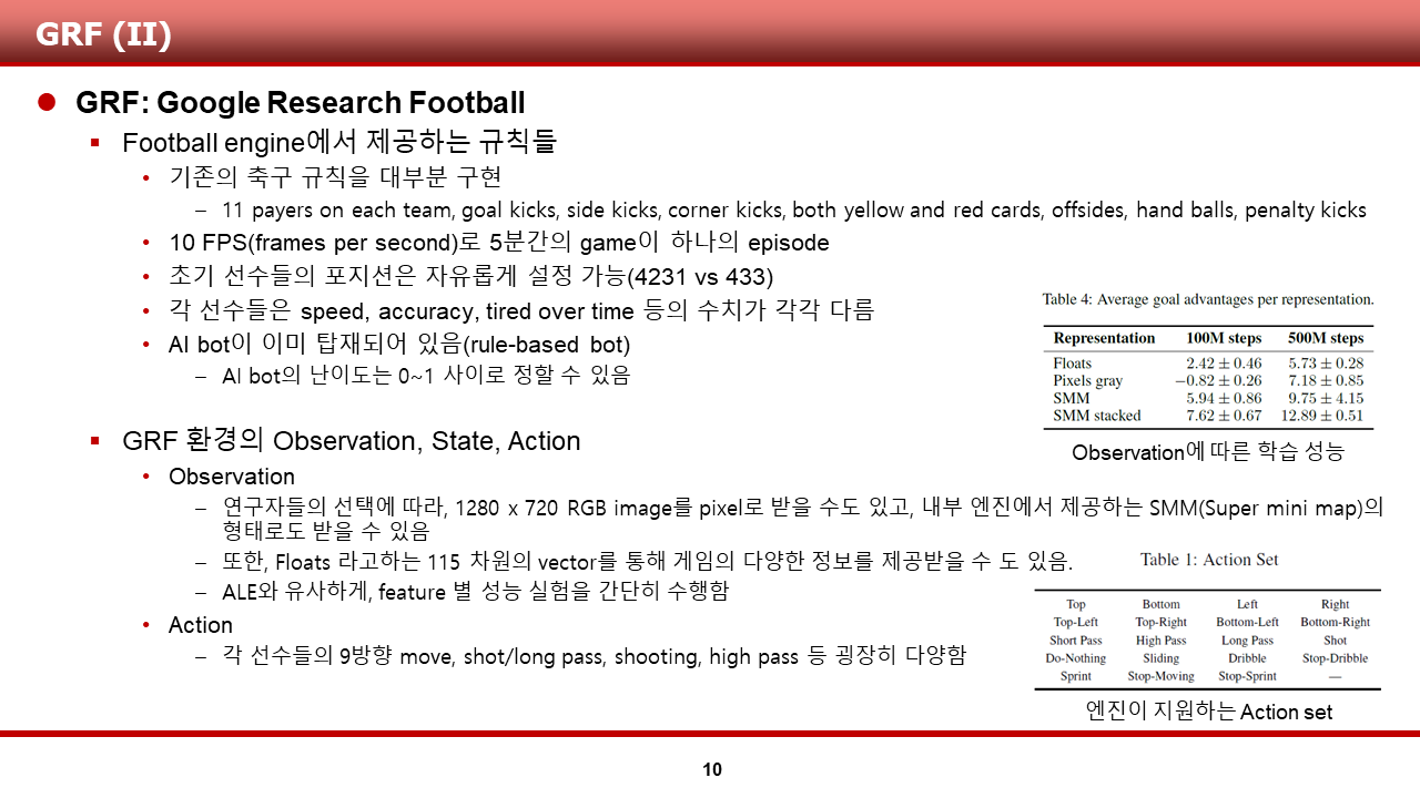 이러한 GRF에서 제공하는 Observation과 Action 역시 정말 다양했습니다. 이 부분은 하나하나 설명하기 보다, 논문 혹은 공식 문서를 통해 참고해야 할 정도로 굉장히 많습니다. (115 차원의 vector를 통한 내부 게임 정보, 게임 화면 등의 observation, 이동, pass를 포함한 굉장히 다양한 action set)