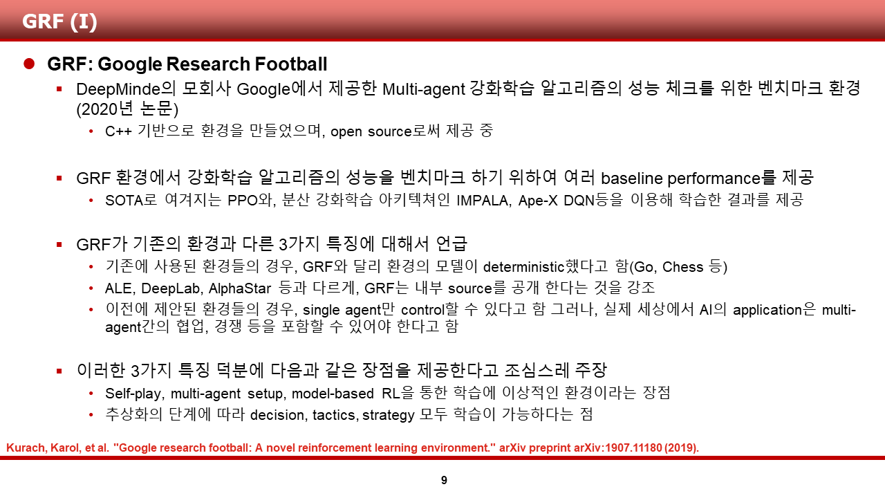 마지막으로 설명드릴 환경은 DeepMind의 모회사 Google에서 제공한 Google Research Football이라고 하는 환경입니다. 이 환경은 2020년 아카이브 논문을 통해 세상에 공개가 되었으며, Multi-agent 강화학습 알고리즘의 학습과 검증에 사용할 수 있는 벤치마크 환경을 제공해 주고 있습니다.