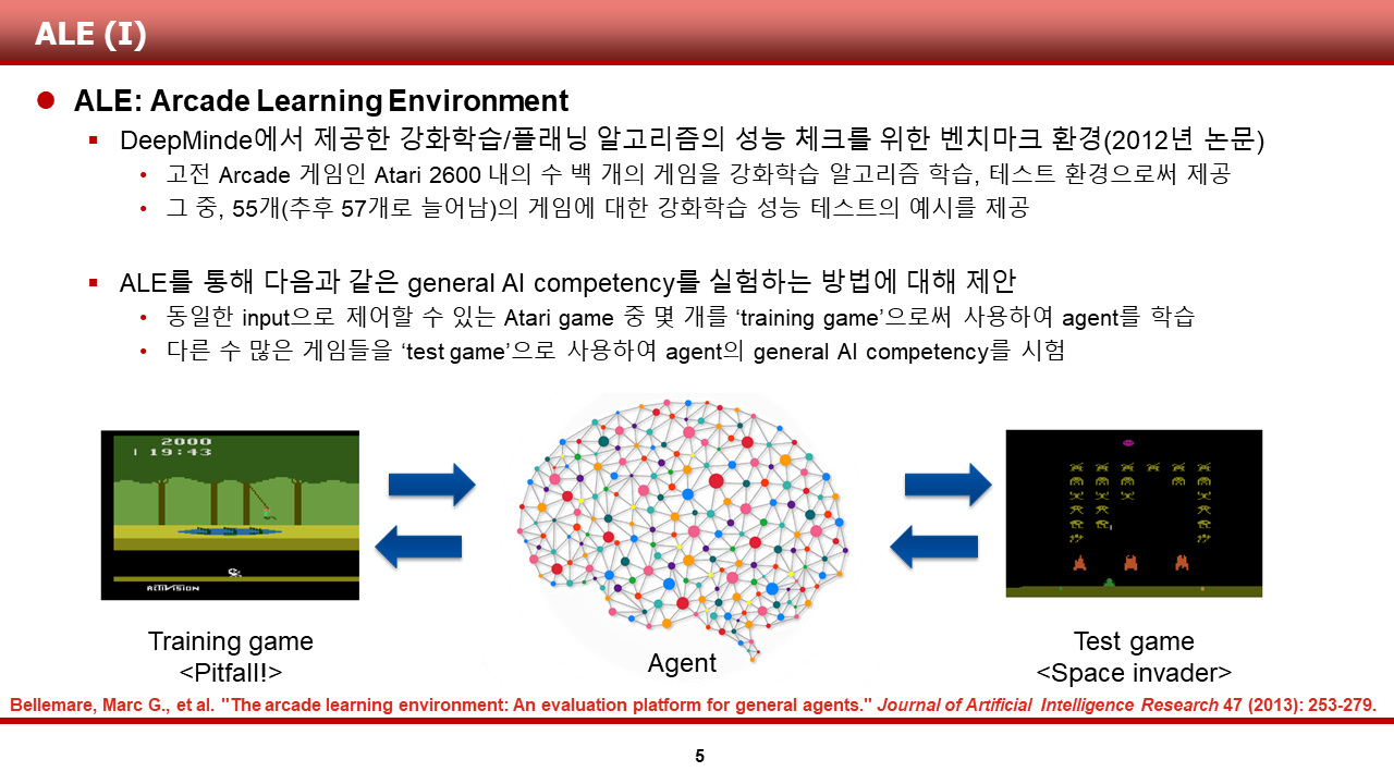 이 논문에서는 이러한 agent를 domain-independent AI 혹은 general AI라고 칭하였으며, 이러한 agent를 연구하기 위해 ALE 환경을 공유하게 되었다고 했습니다. ALE는 고전 게임인 Atari 2600 game의 수 백여개의 게임을 agent를 학습하기 위한 환경으로써 제공하며, 이러한 다양한 game을 수행할 수 있는, domain-independent AI를 최종 목표로 삼는다는 설명이 되어있었습니다.
